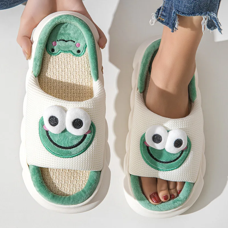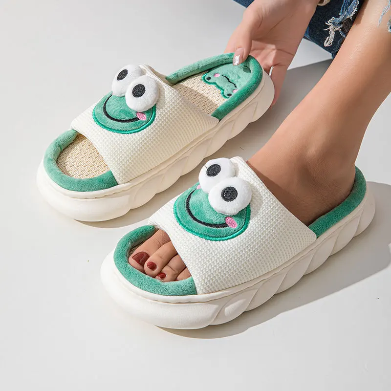 Cute Cow Linen Slippers – Thick Bottom Indoor Flats for Women & Couples