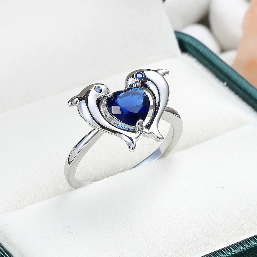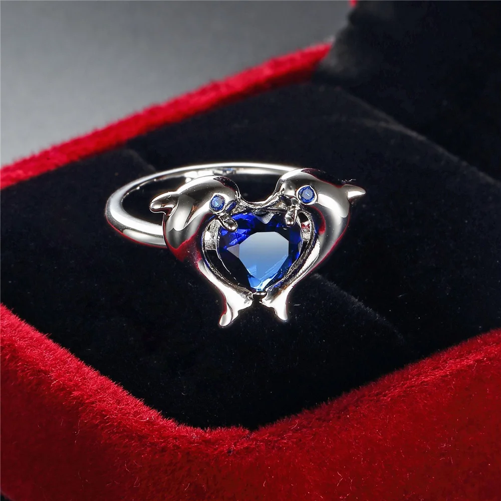 Charm Female Blue Round Zircon Stone Heart Dolphin Engagement Ring Vintage Silver Color